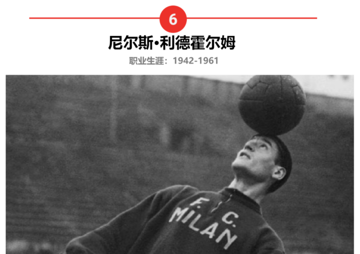 瑞典三剑客的另一位尼尔斯·利德霍尔姆,他不仅是瑞典足球的标杆人物,也是AC米兰历史上最伟大的球员之一。